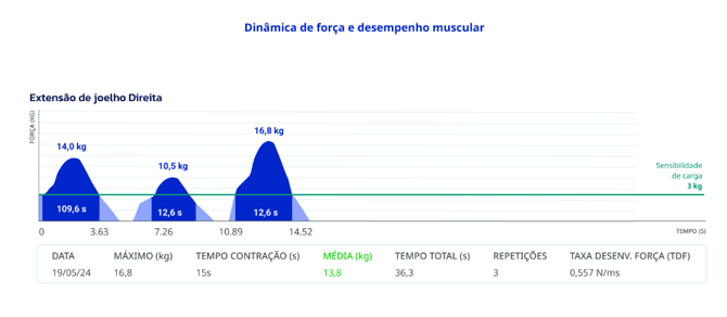 Outro ponto-chave do relatório é o cálculo da Taxa de Desenvolvimento de Força (TDF). Essa métrica avalia a rapidez com que o músculo consegue gerar força desde o início da contração até o seu pico. Para atletas, essa informação é extremamente valiosa, pois a TDF é diretamente relacionada ao desempenho em atividades que exigem acelerações rápidas e explosão muscular.